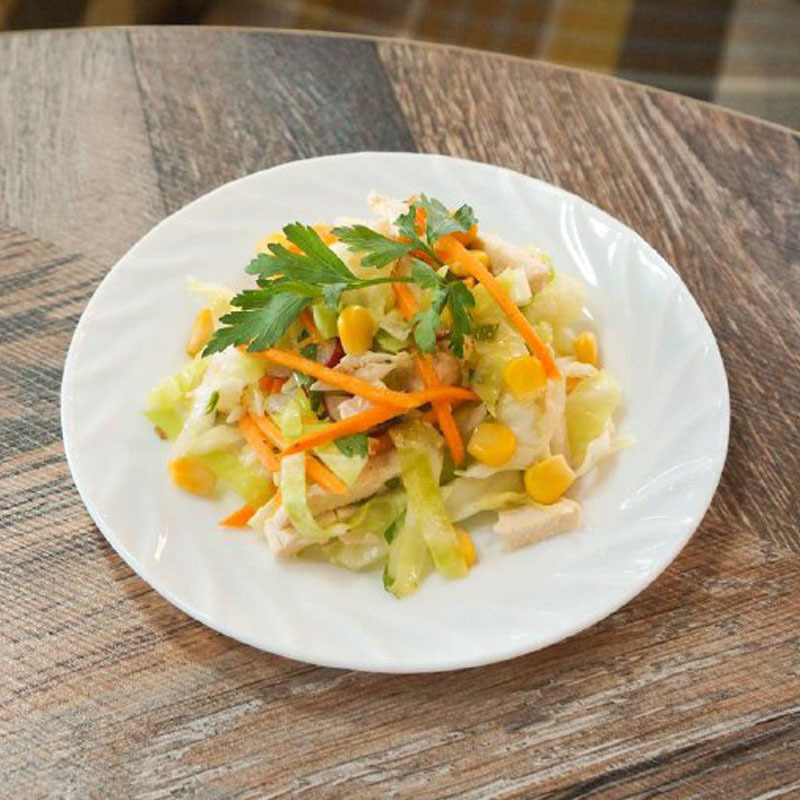 Салат из моркови с кукурузой, копченной курочкой (морковь острая, кукуруза, копчёности куриные, майонез) 239,5 ккал /1002,7кДж (б-13,7,г, ж-20,3г у-23г)