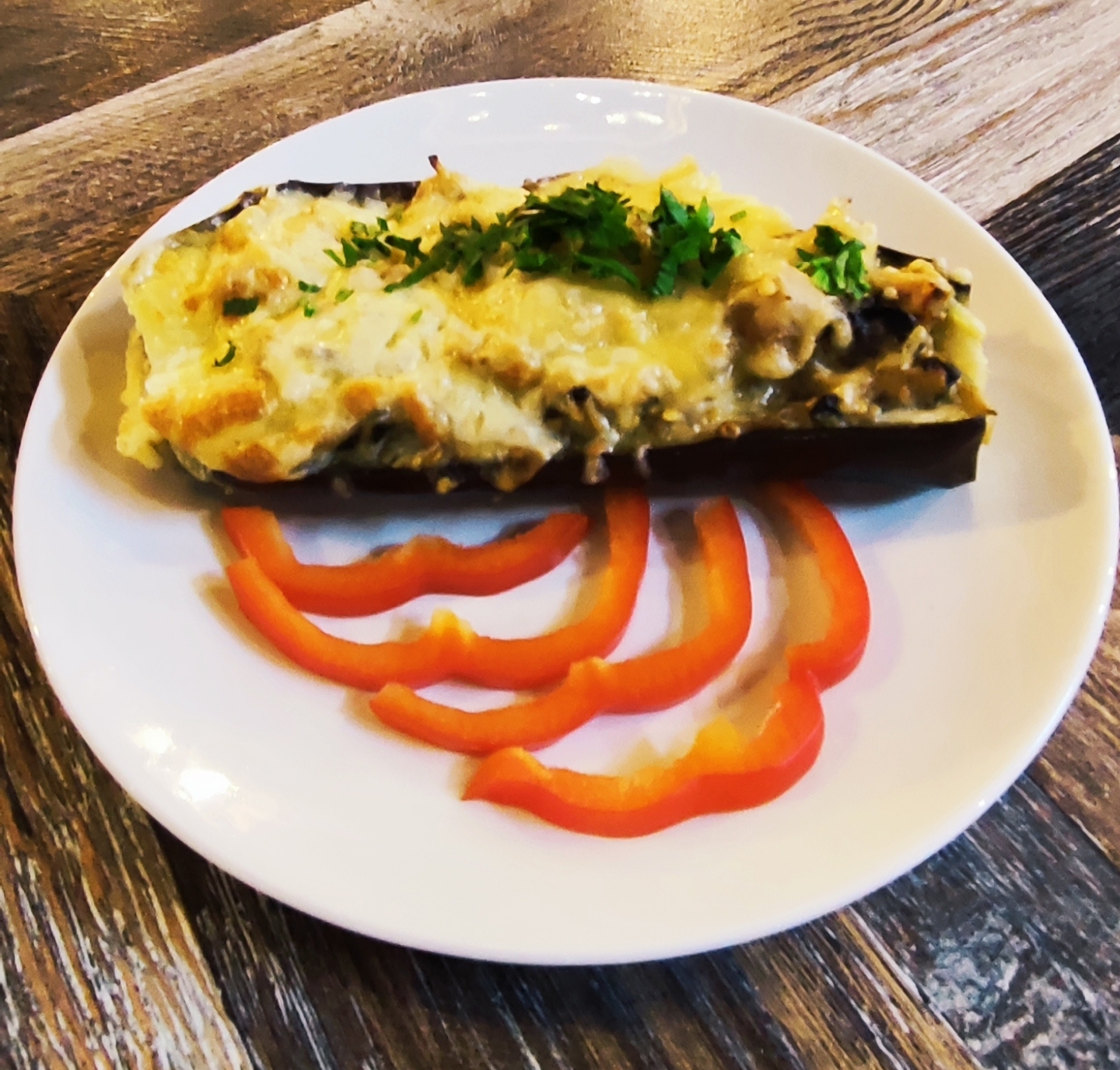 Жульен в баклажане (филе куриное, шампиньоны, жаренный лук,сливки, майонез, сыр) 100 гр.